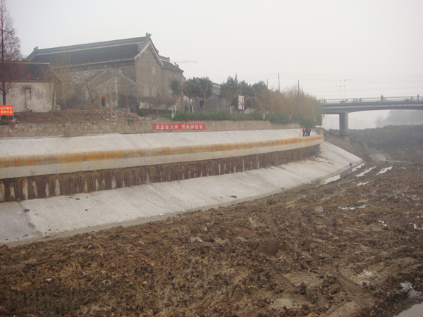 泰州船闸位于泰州市境内、328国道以北的新建口线上,是南官河通江口门口岸闸上游的一个重要梯级。随着船舶量大型化的发展,泰州船闸上游引航道的驳岸损坏日益严重,尤其西仓桥以南的驳岸,船行波掏刷坡底导致护坡坍塌破损,需加固改造。本公司承建的泰州船闸上游引航道护岸加固改造工程项目(A合同段),主要内容为土方开挖、右岸加固改造长度109.5米(Φ800mm钻孔灌注桩长约1159m和旋喷桩)、左岸加固改造长度117米(采用现浇混凝土纵横梁)及相关临时工程的施工和保修。